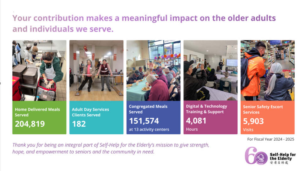 Any donation to Self-Help for the Elderly, no matter the size, goes a long way in helping to empower senior citizens, improving their quality of life, and promoting their independence, dignity and self-worth.